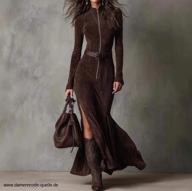 A-Linie Langarm Wildleder Stil Kleid Elegant in Braun