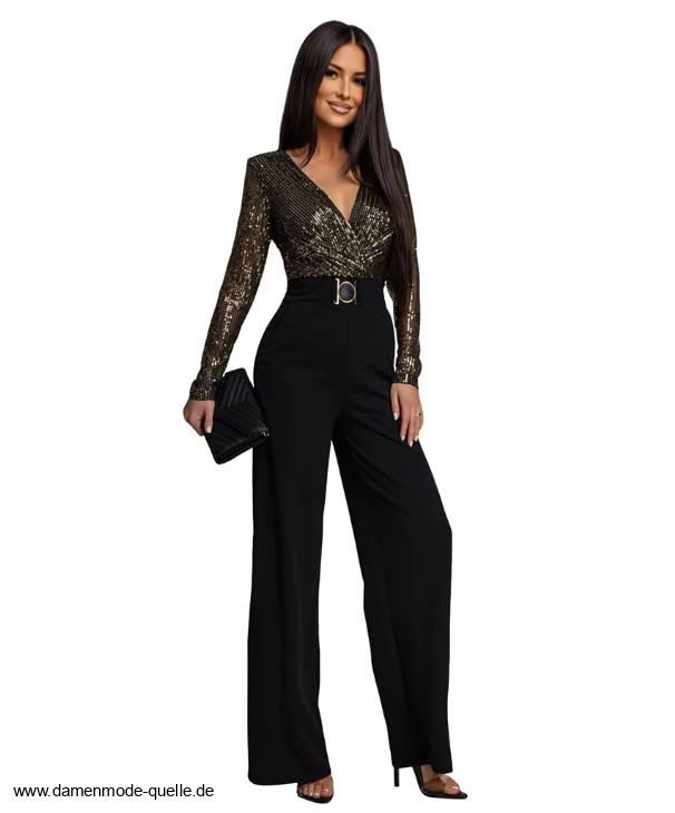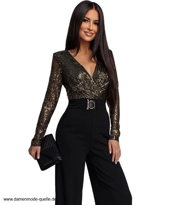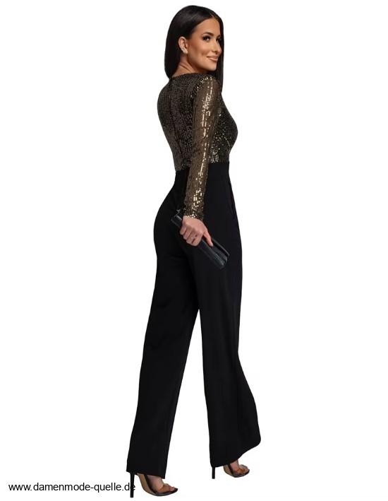 Einführung » Jumpsuit Einteiler 2026 » Glitzer Pailletten Einteiler Jumpsuit Danica Elegant in Gold Schwarz
