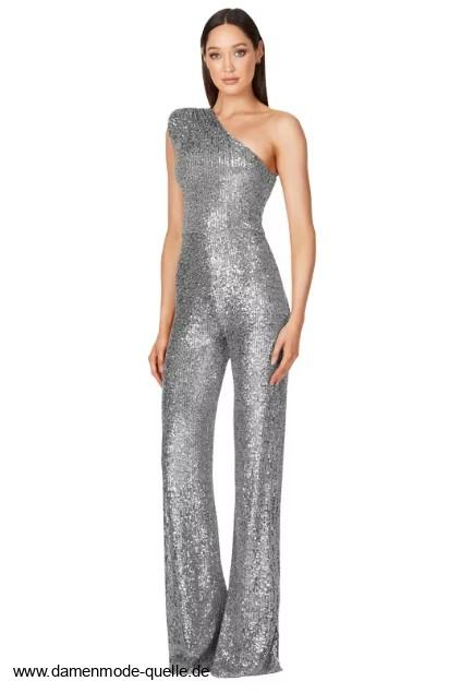 Einführung » Jumpsuit Einteiler 2025 - 2026 » One Shoulder Glitzer Einteiler Jumpsuit Elegant und Festlich in Silber